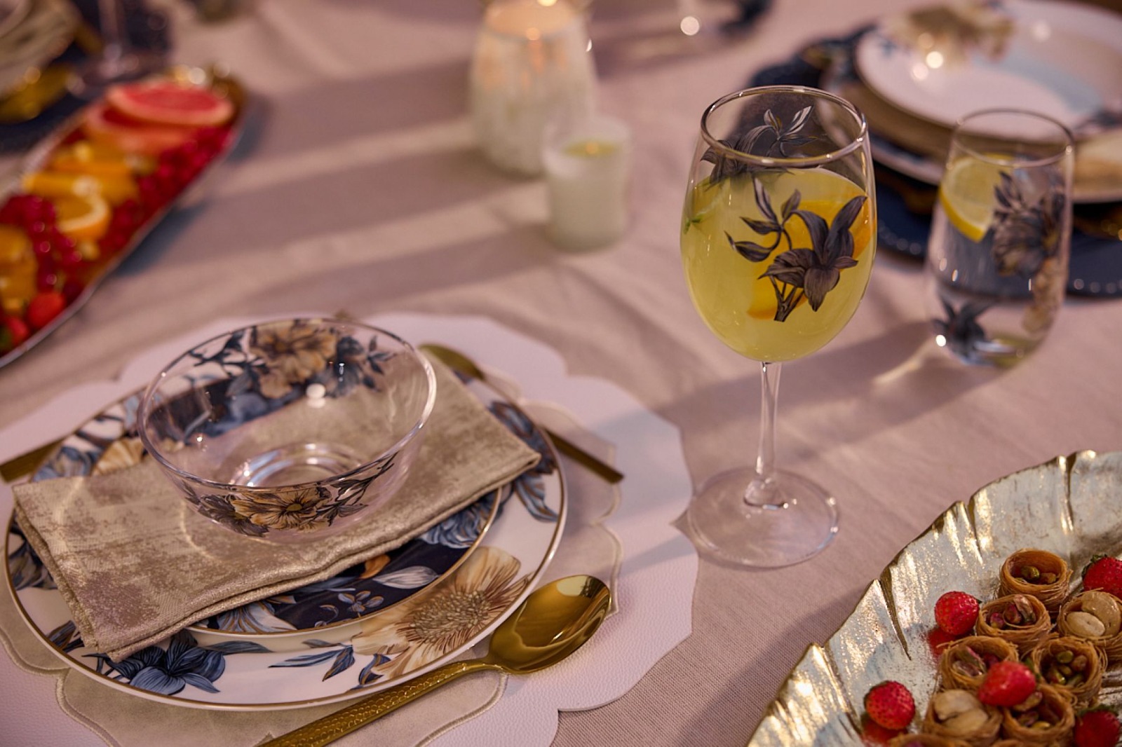 تتميز مجموعة زهراء بألوانها الزرقاء الداكنة، وتدرجاتها الحيادية الدافئة، ولمساتها المشرقة بالذهبي، مما يضفي على المائدة وغرفة المعيشة حضوراً واثقاً يفيض بالأناقة، ويضمن للعائلات العاشقة للفخامة الكلاسيكية العصرية التباهي بتجربة ضيافة من عالم الخيال.